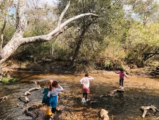 Three Kindergarten children on a rock by a creek surrounded by trees