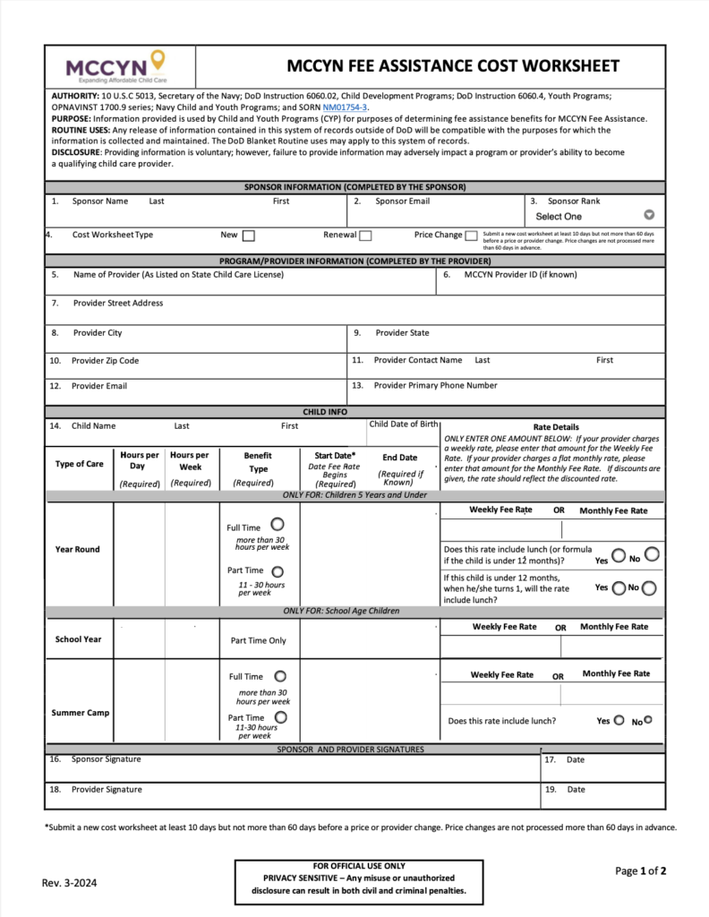 Once the military informs a family they are eligible for the subsidy (there may be a waitlist), the family must find care and then submit a cost worksheet to the subsidy processing office. Below is what the cost worksheet typically looks like. It requires us to complete a portion of the form and sign it. When the military sends you the cost worksheet, fill out what you can (use the preschool’s address), and send it to howard@aspenleafpreschool.com to complete and sign.