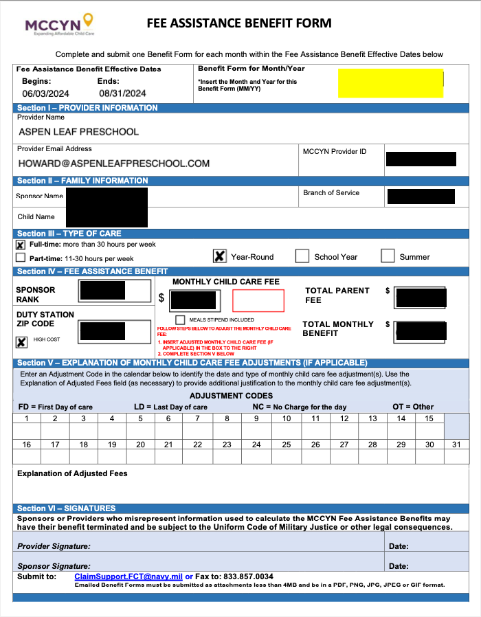 After MCCYN processes your cost worksheet, they will send you a Fee Assistance Benefit Form, which is the form you will submit each month to actually receive the subsidy payment. The form looks like this: